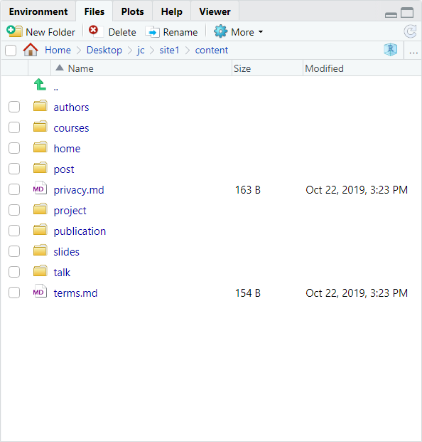 **Does not create a project** ] -- .bottom[ more *Hugo themes* can be found at https://themes.gohugo.io/ ] --- ## 1) build website .pull-left[ #### RStudio  ] .pull-right[ #### File explorer DIY ] --- ## 1) build website .pull-left[ #### RStudio  ] .pull-right[ #### File explorer DIY ] --- ## 1) build website .pull-left[ #### RStudio  ] .pull-right[ #### Console ```r blogdown::serve_site() ``` ] --- ## 1) build website ` Serving the directory C:\Users\jog54yy\Desktop\jc\site1 at http://127.0.0.1:6868 ` -- .pull-left[ #### RStudio  ] .pull-right[ #### Browser  ] --- ## 1) build website .pull-left[ #### RStudio  ] .pull-right[ #### File explorer DIY ] --- background-image: url(http://cliparts.co/cliparts/rcL/n4q/rcLn4qBAi.png) background-size: 300px 300px # website built --- ## 2) modify website .pull-left[  ] .pull-right[ 0. config.toml 0. content/ 0. static/ 0. themes/ ] -- Documentation for the *academic* theme at: https://sourcethemes.com/academic/ --- ## 2) modify website ### config.toml .pull-left[ ```toml # Configuration of Academic # Documentation: https://sourcethemes.com/academic/ # # This file is formatted using TOML syntax - learn more at https://learnxinyminutes.com/docs/toml/ # Each configuration section is defined by a name in square brackets (e.g. `[outputs]`). # Title of your site title = "Academic" # The URL of your site. # End your URL with a `/` trailing slash, e.g. `https://example.com/`. baseurl = "/" # Enter a copyright notice to display in the site footer. # To display a copyright symbol, type `©`. For current year, type `{year}`. copyright = "" ############################ ``` ] .pull-right[ ```toml # Configuration of Academic # Documentation: https://sourcethemes.com/academic/ # # This file is formatted using TOML syntax - learn more at https://learnxinyminutes.com/docs/toml/ # Each configuration section is defined by a name in square brackets (e.g. `[outputs]`). # Title of your site title = "This is actually personalized!" # The URL of your site. # End your URL with a `/` trailing slash, e.g. `https://example.com/`. baseurl = "/" # Enter a copyright notice to display in the site footer. # To display a copyright symbol, type `©`. For current year, type `{year}`. copyright = "" ############################ ``` ] --- ## 2) modify website ### content/ .pull-left[  ] -- .pull-right[  ] --- ## 2) modify website ### content/ .pull-left[  ] .pull-right[  ] --- ## 2) modify website ### static/ --- ## 2) modify website ### themes/ --- background-image: url(http://cliparts.co/cliparts/rcL/n4q/rcLn4qBAi.png) background-size: 300px 300px # website modified! --- background-image: url(https://www.netlify.com/img/global/favicon/apple-touch-icon.png) background-size: 300px 300px --- background-image: url(https://www.netlify.com/img/global/favicon/apple-touch-icon.png) background-size: 100px 100px background-position: 96% 3% ## 3) publish website -- ### make a netlify account Go to [netlify.com](https://app.netlify.com/signup) and sign-up -- ### drag & drop the folder *public*  For updates go to *Deploys* and drag & drop *public* folder --- background-image: url(http://cliparts.co/cliparts/rcL/n4q/rcLn4qBAi.png) background-size: 300px 300px # website published --- class: inverse, middle, center # That's it! --- class: bottom, center background-image: url(https://bookdown.org/yihui/blogdown/images/cover.png) background-size: 275px 400px ## https://bookdown.org/yihui/blogdown/ --- class: inverse # open topics + Blogposts verfassen + GitHub Integration + Eigene Domain nutzen + Integration mit GitHub-Pages --- ## Theme anpassen --- ## Blogpost verfassen --- background-image: url(https://github.com/fluidicon.png) background-size: 100px 100px background-position: 96% 3% ## GitHub Integration + GitHub Account erstellen + Netlify zugriff auf das Respository gewähren + Netlify kann die Seite mit einer eigenen HUGO-*Engine* generieren, oder + Seite lokal generieren (wie wir es eben getan haben) + GitHub *push* löst *Deployment* auf Netlify aus. --- ## Eigene Domain nutzen --- ## Integration mit GitHub-Pages